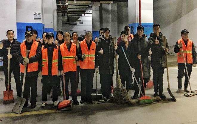 卡卡湾厅集团志愿者们迎难而上,将卫生状况最差的五期地下车库有序的进行地面清扫、垃圾归位和清理卫生死角。针对积累已久的地面灰尘,志愿者们不怕脏和累,干的十分带劲;很多比较难清理的地面胶水,志愿者们细致的用铲子一点一点清除;入户电梯口附近的设备房施工杂物众多,灰尘极厚,但这块“难啃的骨头”在志愿者和环卫工人的共同努力下也被清扫干净。